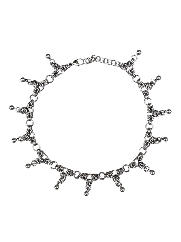 Fun choker made out of byzantine weave fractions completed with stainless steel ball pendants. 100% polished stainless steel with a lobster clasp closing. -----------------------------------------------------------------------------------