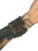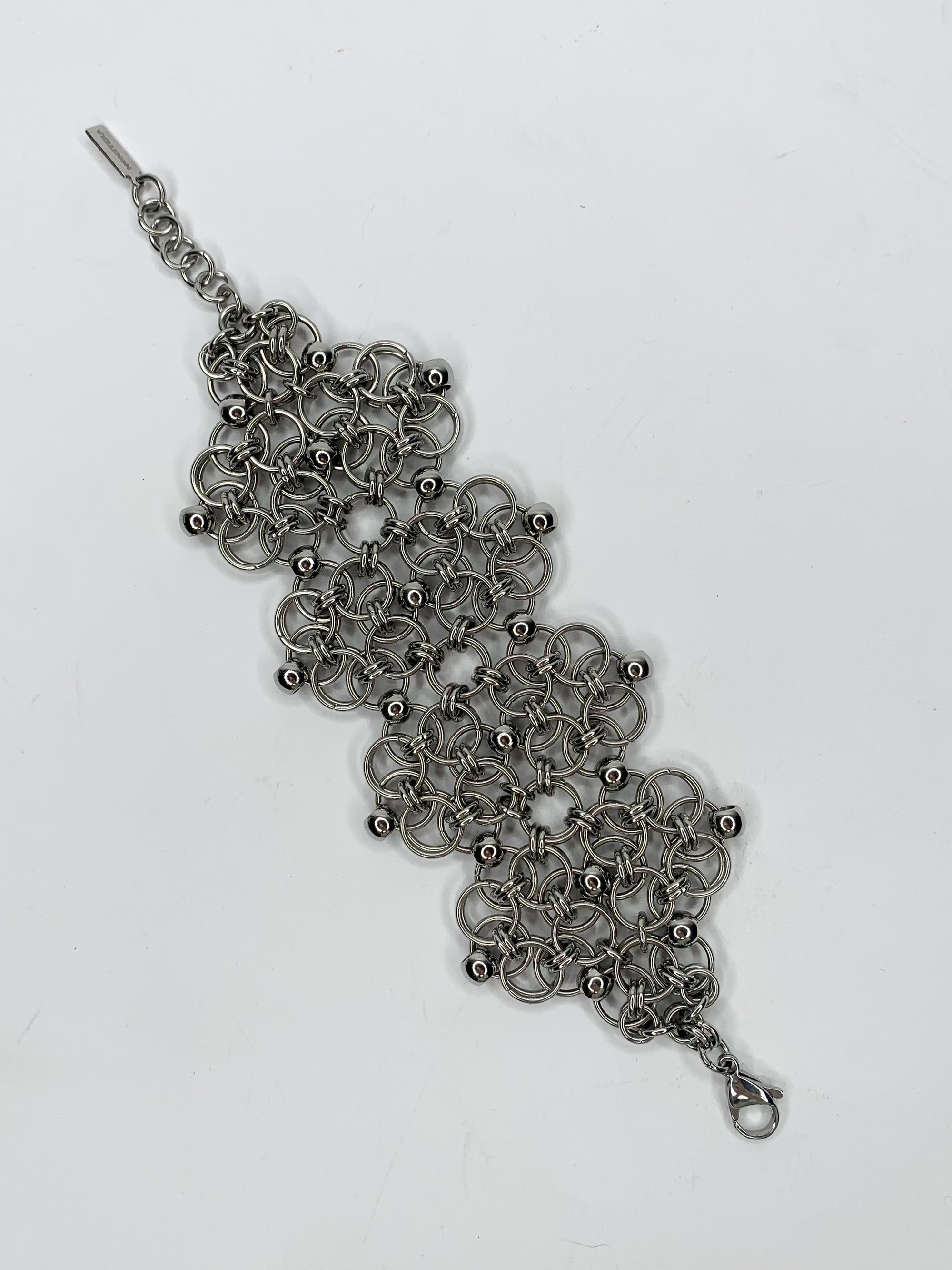 A garden forged in metal, this wide cuff blooms with intricate helm weave flowers. Polished stainless steel beads accent each motif, blending strength and softness in a fashion statement.
