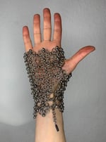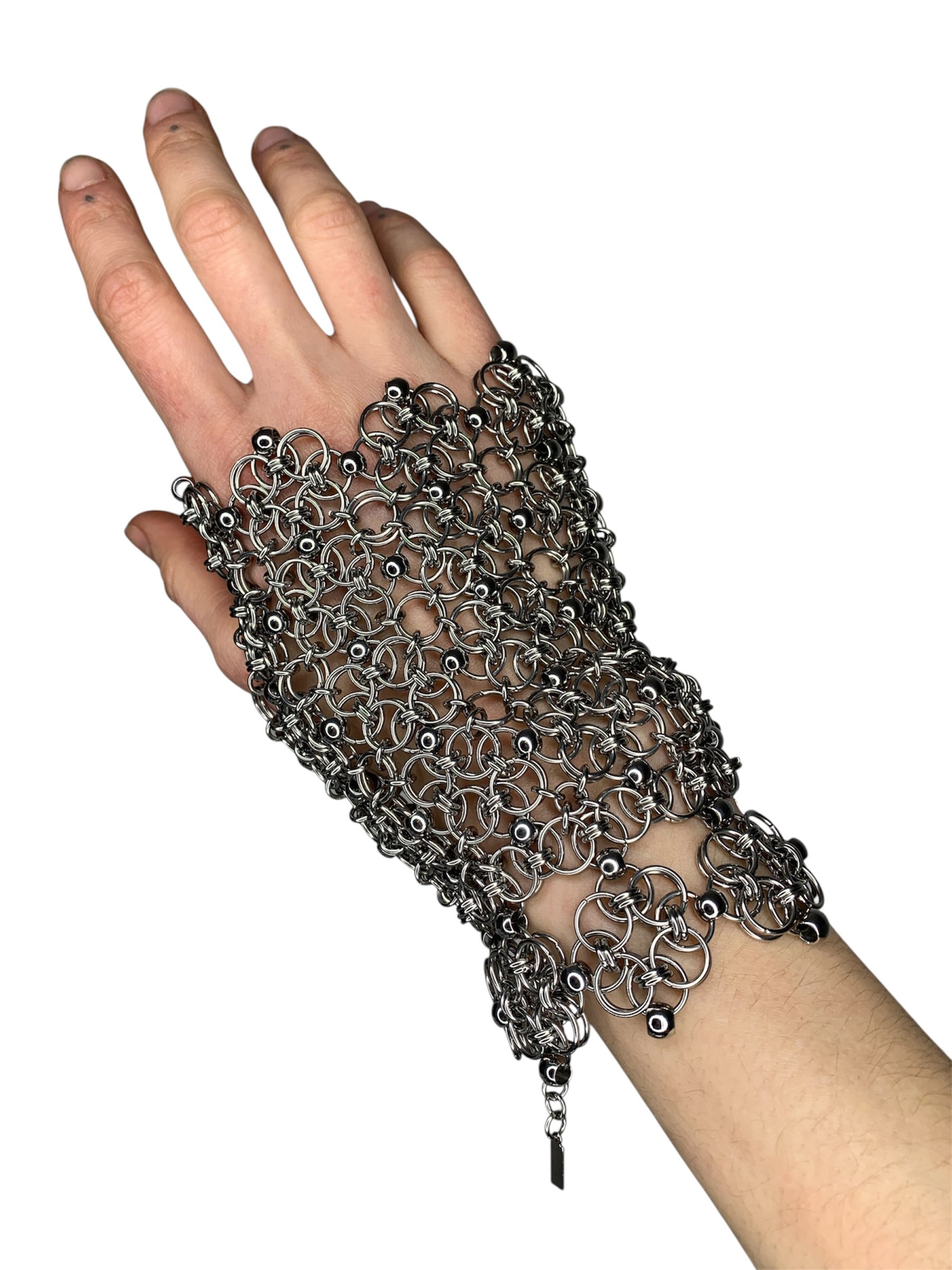 A garden forged in metal, this chainmaille fingerless glovelette blooms with intricate helm weave flowers. Polished stainless steel beads accent each motif, blending strength and softness in a fashion statement.